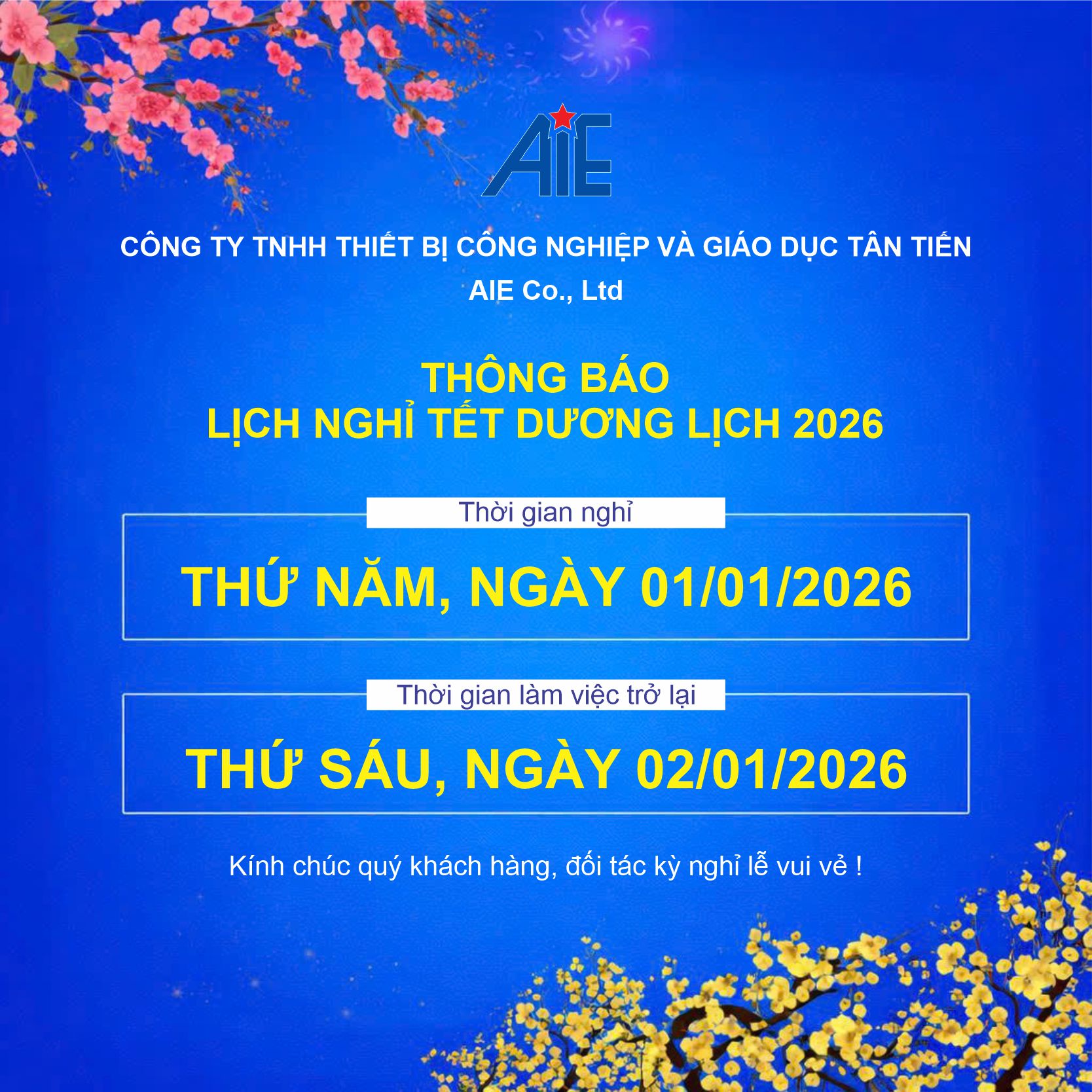🌟 Công ty TNHH Thiết bị Công nghiệp và Giáo dục Tân Tiến (AIE Co., Ltd) trân trọng thông báo lịch nghỉ Tết Dương lịch năm 2026 như sau: